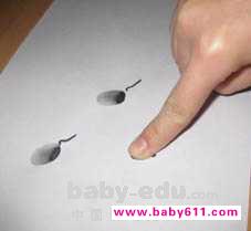 (1) 教師示范:用右手食指的指腹在黑色顏料中輕輕蘸一下,然后把指腹按在紙上再提起,這樣小蝌蚪圓圓的身體就出來了。