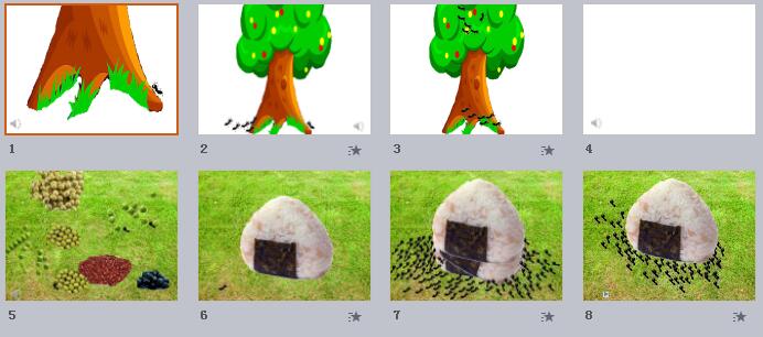 v 結(jié)合媒體變化,教師用響板表現(xiàn),小螞蟻叫伙伴一起搬飯團,伙伴越來越多,腳步聲越來越響的故事情景。