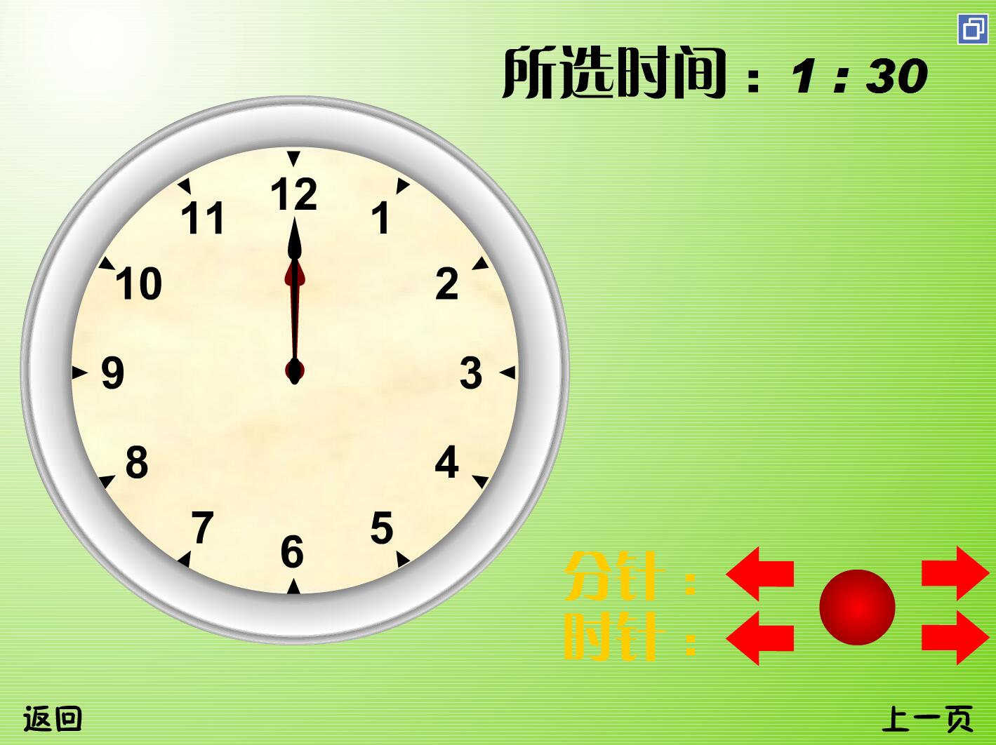 “動畫時鐘”用鼠標可以隨意撥動時鐘和分針,讓幼兒了解分針轉一圈時針轉一格,認識整點、半點等。