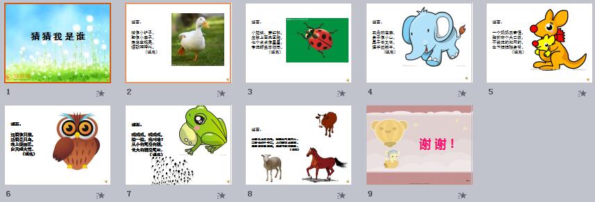 此課件總共9頁,分別包含了:鴨子、瓢蟲、大象、袋鼠、貓頭鷹、青蛙、牛、羊、馬的謎語,包含配音,請點擊下方按鈕進行下載。