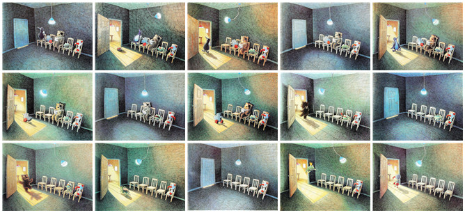 《第五個》繪本PPT。五個殘缺不全的玩具在一間昏暗的房間里等待著,然后一個接一個地消失在門后,又煥然一新地走出來。排在第五個的小木偶越來越害怕,門后面是什么呢?小木偶推開門,門后面原來是個親切的醫生,一點也不可怕。本書意在給孩子無畏的勇氣,克服黑暗和恐懼……第五個ppt下載,第五個繪本故事ppt。