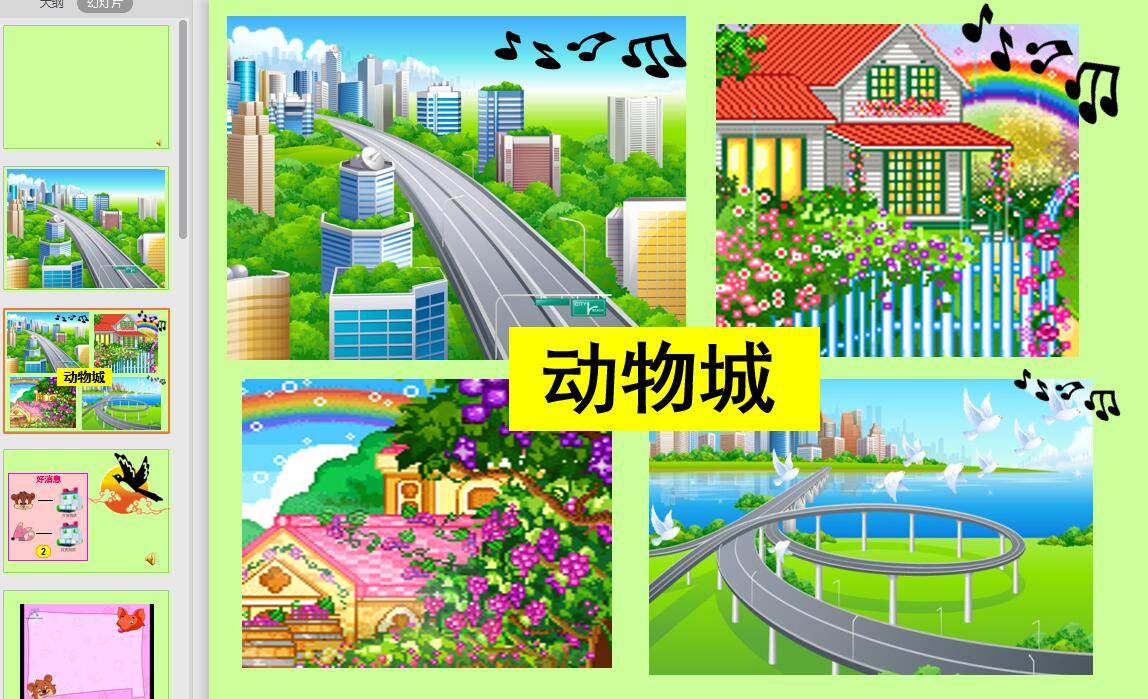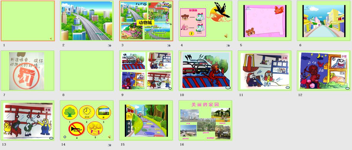 1、出示ppt圖片,看看動物城的環境照片,初步感受動物城內生活環境的優美
