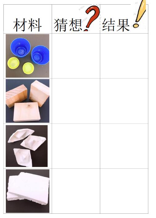 小結(jié):第一列是材料,第二列記錄猜想,第三列記錄實(shí)驗(yàn)結(jié)果。